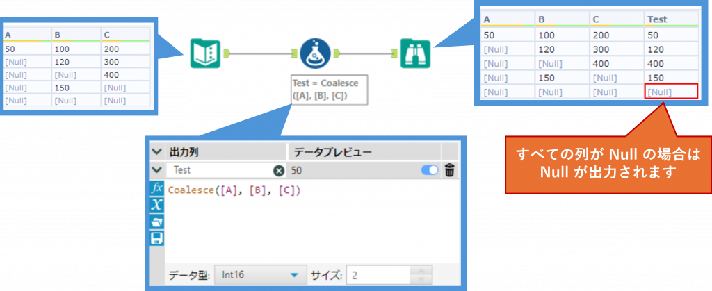 同じ入力データでも、Coalesce 関数の最後に値を指定するかどうかで、すべての列が Null の場合の出力結果が異なります。