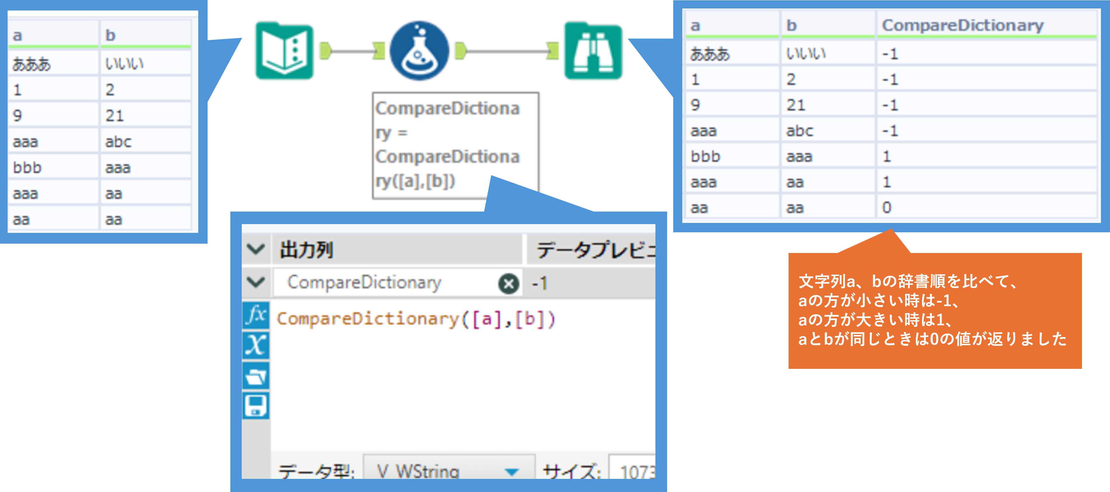 | 2つの文字列を比較 | CompareDictionary(a,b) | 2つの文字列を辞書順に比較します |