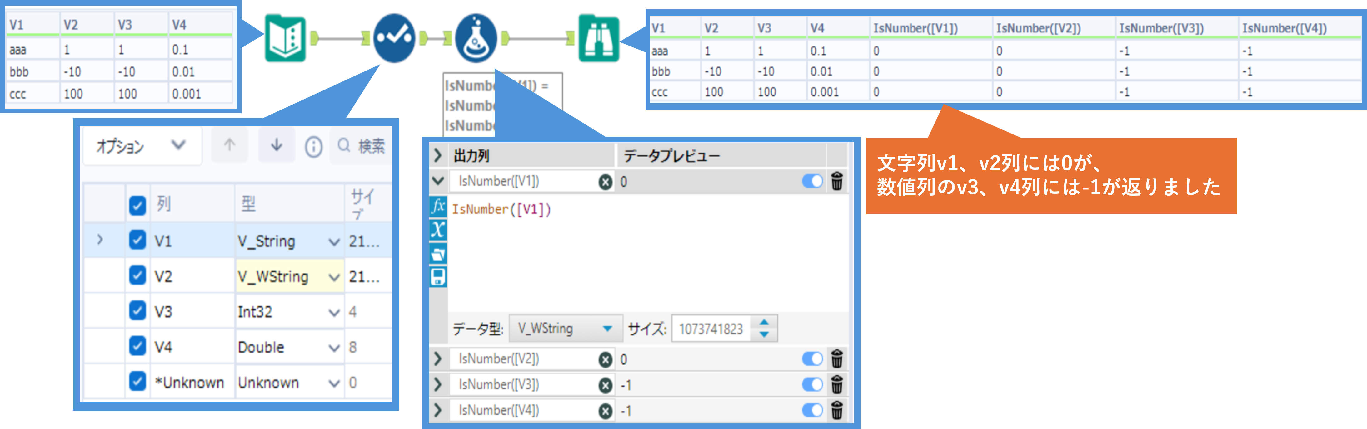 注意点として、値自体が数値でもデータ型が文字列型であれば文字列型として判定されるため、実質としてはフィールドの型自体の判定になっています。