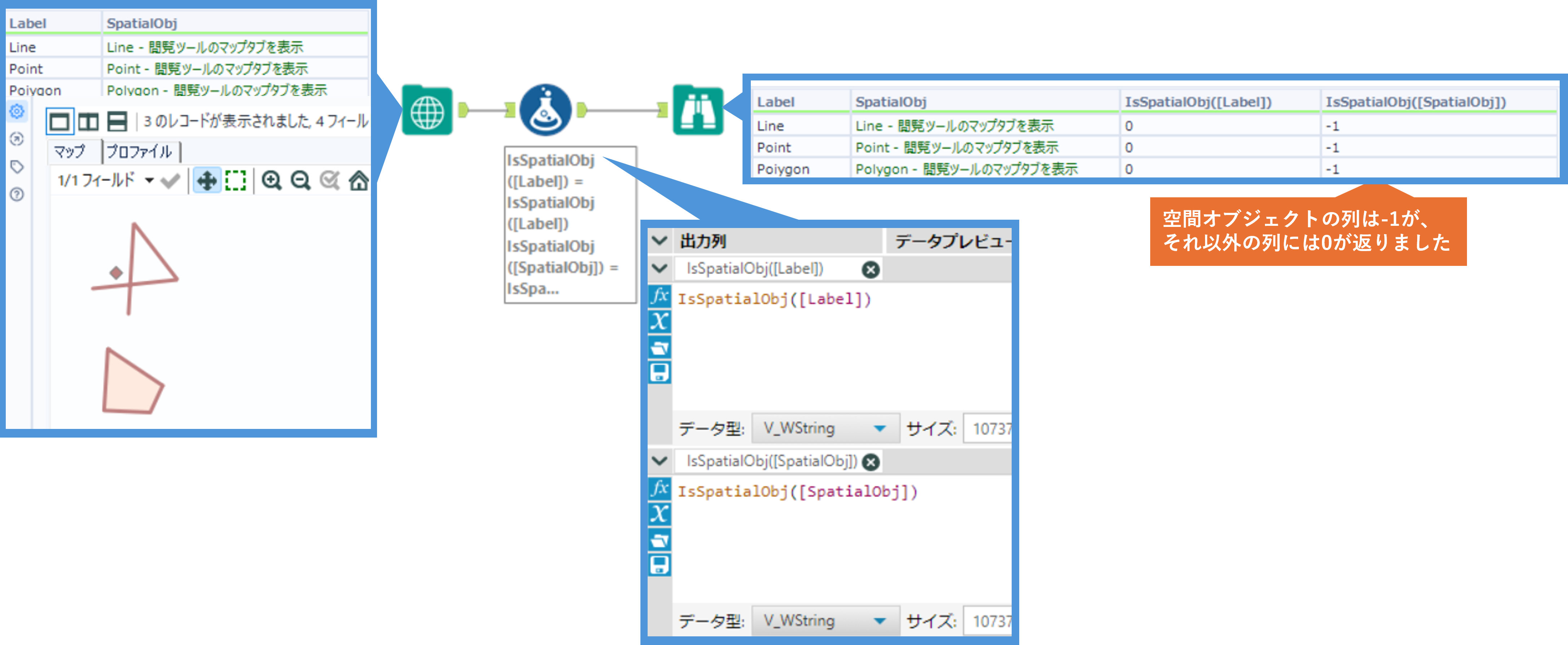 指定した列が空間オブジェクトの場合は -1(True)、それ以外の場合は 0 (False)の値を返します。戻り値はBool型となります。