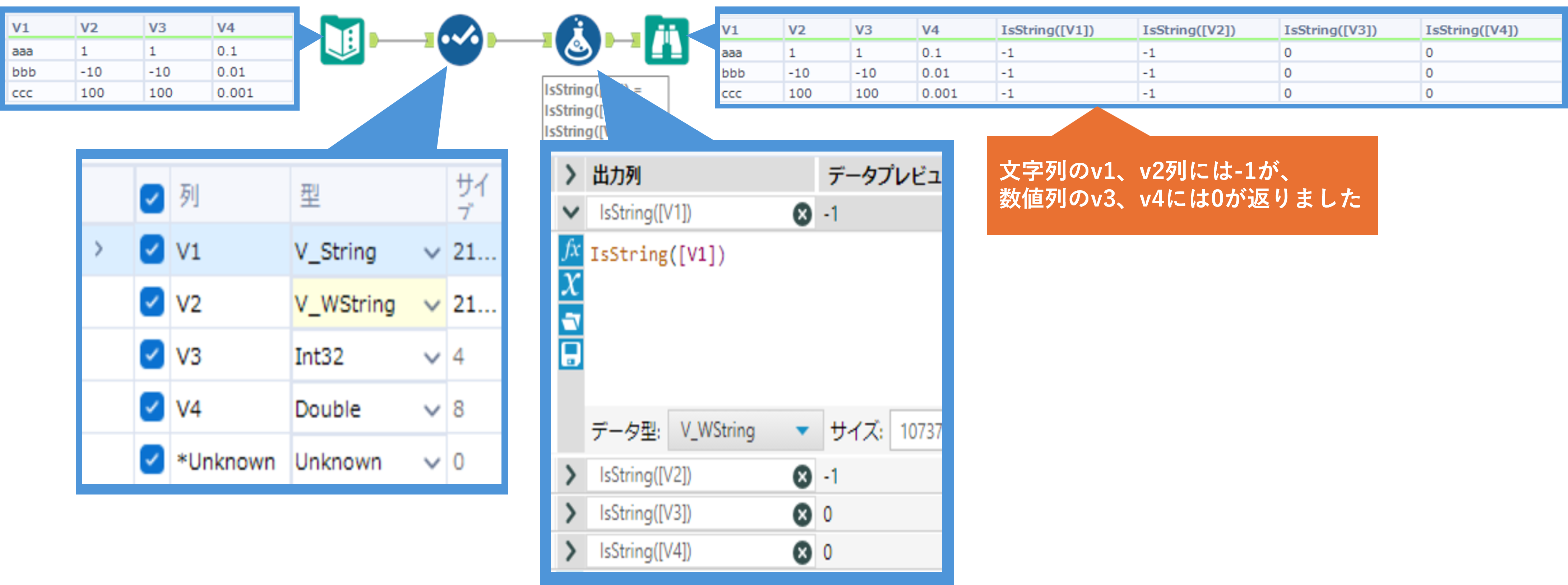 指定した列が文字列の場合は -1(True)、それ以外の場合は 0 (False)の値を返します。戻り値はBool型となります。