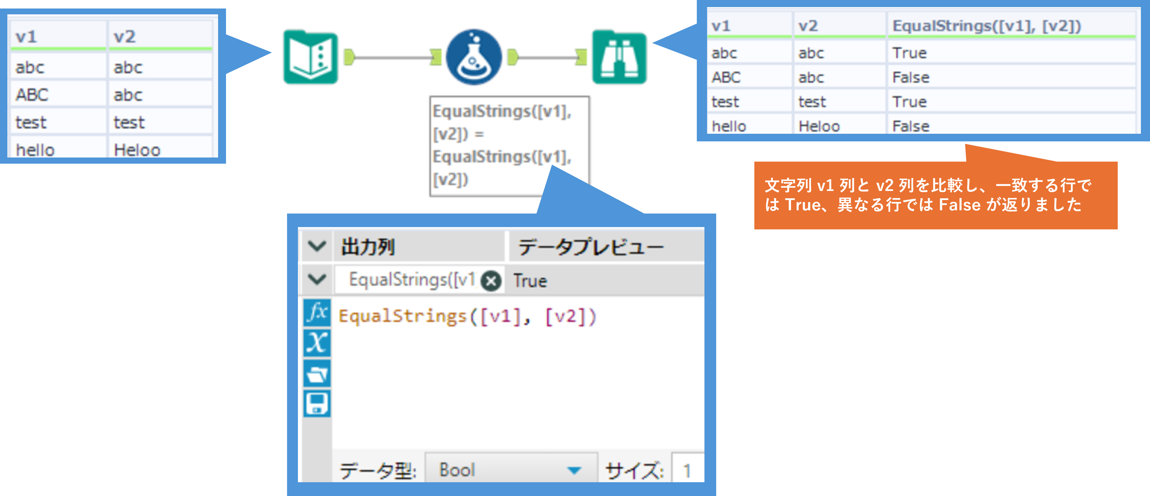 | 2つの文字列を比較 | EqualStrings(a,b) | 2つの文字列が等しいかどうか判定します |