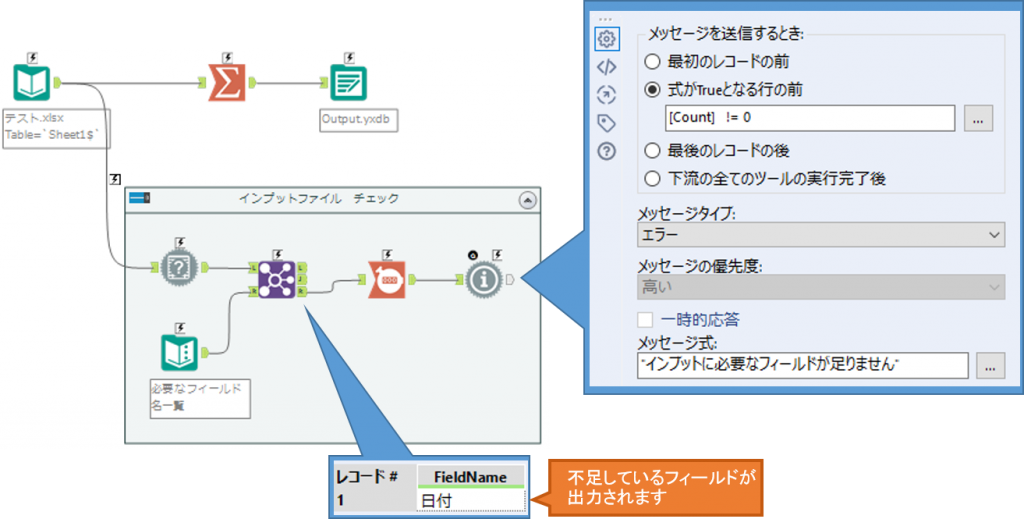 チェック機能のメッセージツールは、インプットファイルに問題がなければ「Count」列に 0 の値、問題があれば 1 以上の値が入っています。この「Count」列をフィールド付加ですべてのレコードに付与し、メッセージツールで値が 0 ではない場合(ファイルチェックで問題があった場合)にエラーを出すように設定します。