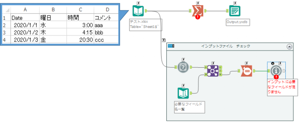 今度は、チェック機能を利用して、インプットファイルに問題があればエラーやメッセージを出力、問題がない場合は次の処理へ進むというフローにしてみます。