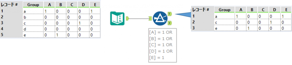 A列からE列まで、5つの列に0と1が入っています。この中から、A列からE列で一つでも「1」の値があるGroupを抽出します。