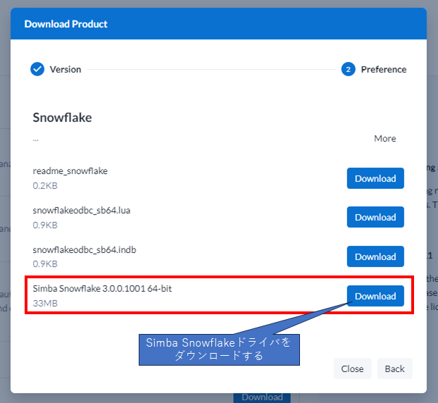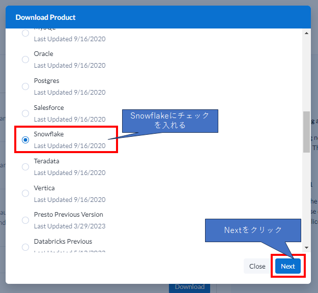 「Download」をクリックすると以下のようにポップアップするので、数あるドライバーの中から「Snowflake」を選択し、「Next」をクリックします。