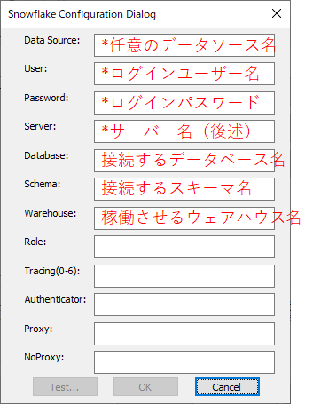 - User:接続する際のSnowflakeユーザーのログイン名。必須項目。