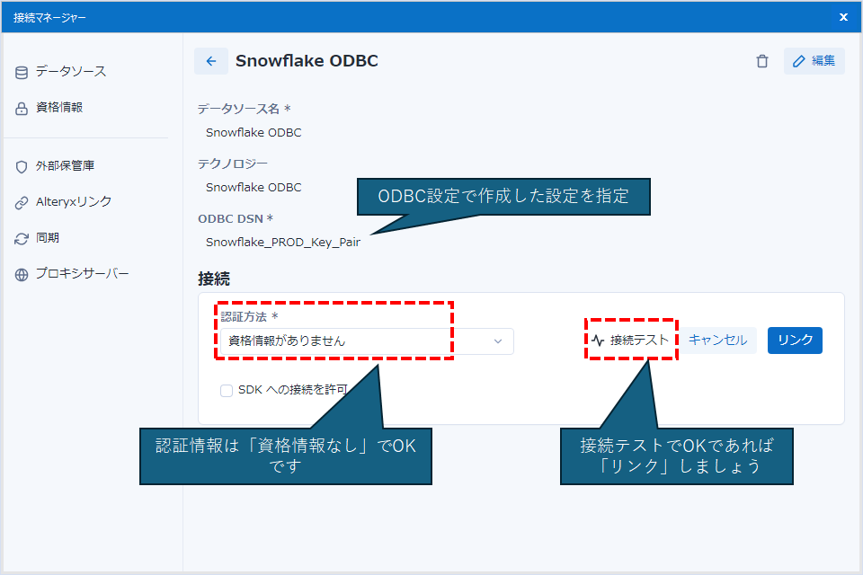 DCM設定からのODBCドライバの設定については、資格情報が不要になります(パスワードを使わないように変わりに秘密鍵を使った認証なので当然ですかね・・・)。