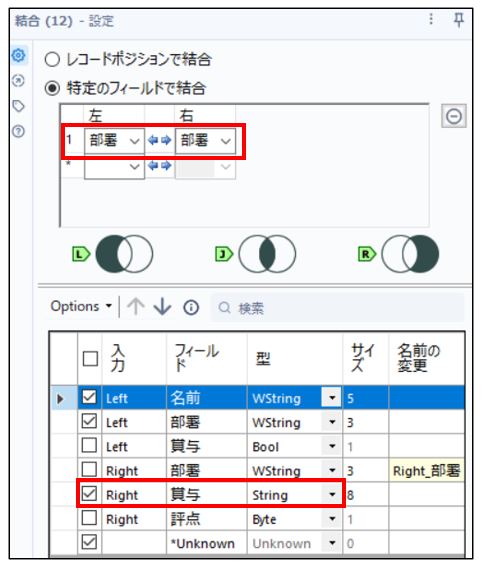 検索値が入っているカラムは(部署)ですので、「結合ツール」の設定では(部署)を結合キーとして設定します。
