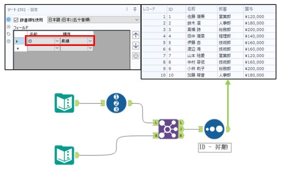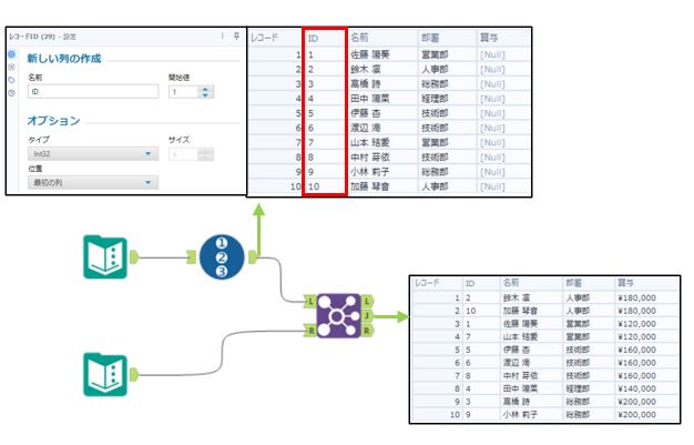 しかし、並び順が部署の名前順になりました。もし、最初の並び順で出力したい場合は3つのツールを追加します。