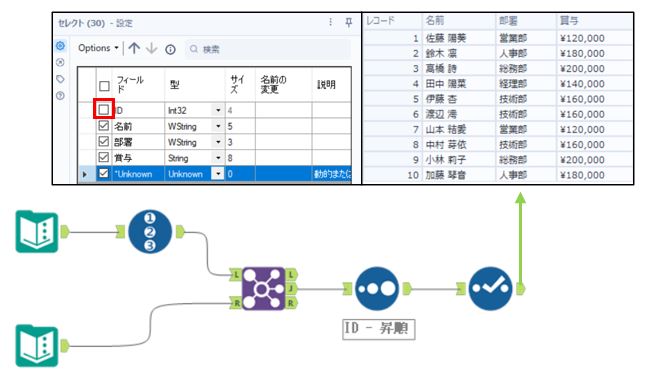 出力としては「部署別賞与基準表」の賞与データを持ってくるために、右アンカー(部署別賞与基準表)の賞与カラムだけ選択します。