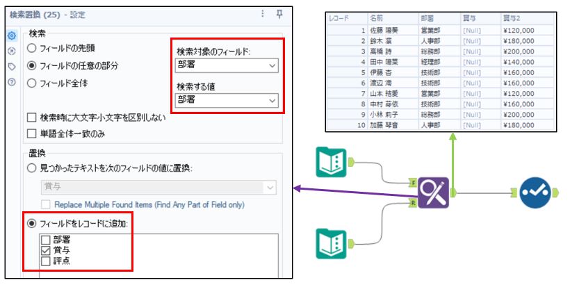 検索値が入っているカラム(部署)を「検索対象のフィールド」、「検索する値」として設定し、部署名が同じだった場合(賞与)フィールドをレコードに追加します。