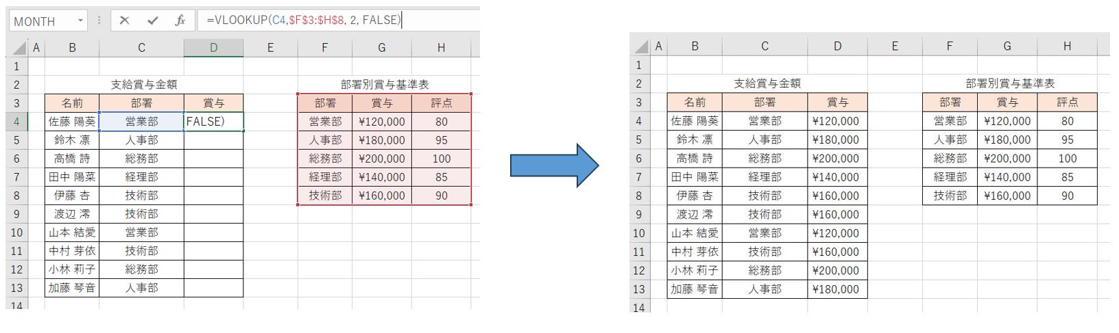 VLOOKUP("部署"、「部署別賞与基準表」、2、FALSE)
