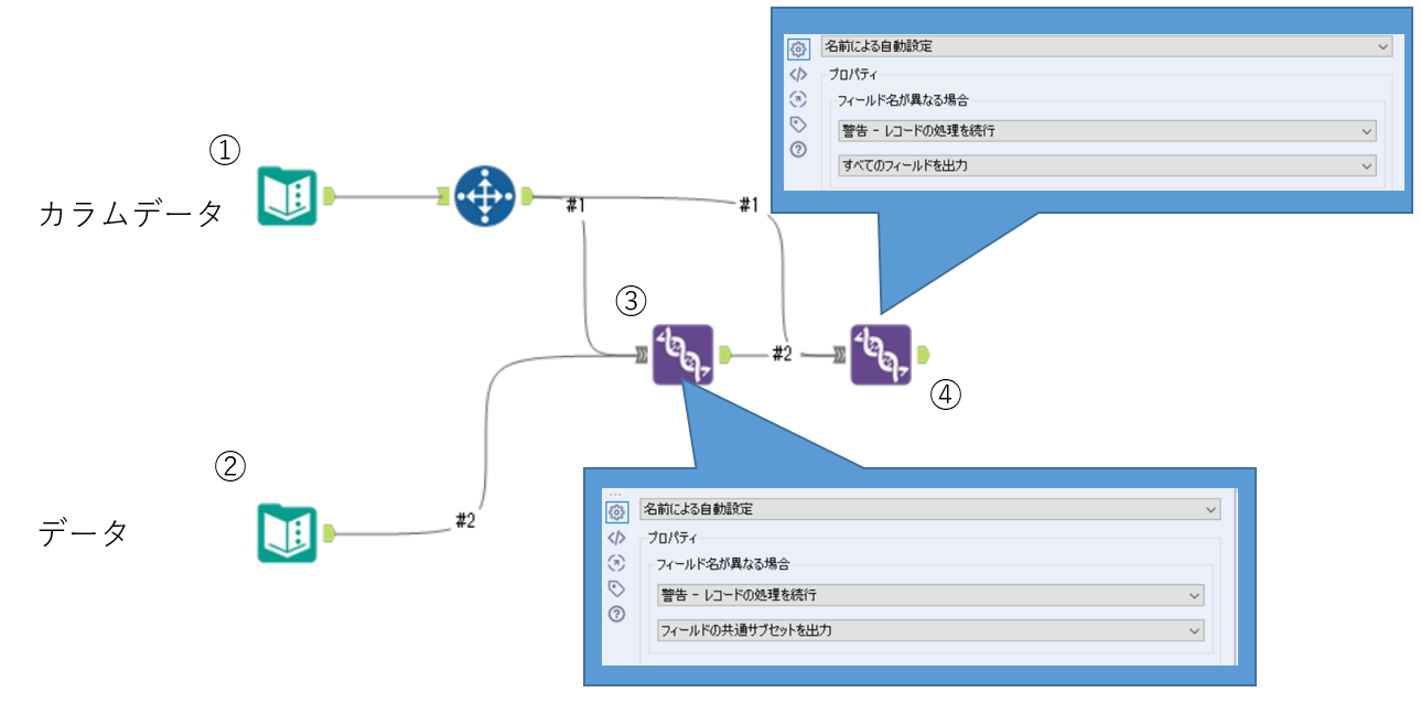 基本構造はこのように組みます。①からはカラムとなる項目データをレコード選択ツールで「範囲を0」で項目データのみにして、②のデータを③のユニオンツールを使い「フィールドの共通サブセットを出力」することで項目を選択します。さらに④で「すべてのフィールドを出力」することで、データに選択する項目が無い場合でも、①の項目のデータは全て選択することができます。