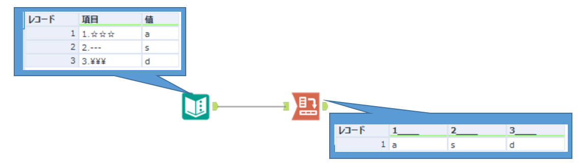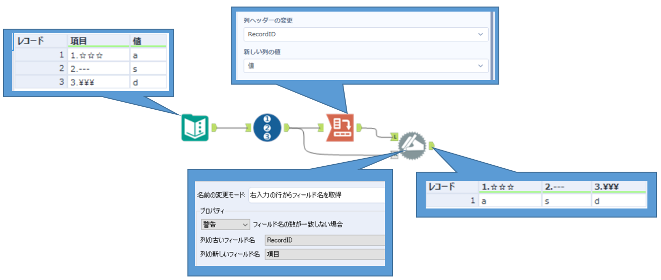 このようにレコードツールでRecordIDを振りRecordIDを列ヘッダーに設定し、動的リネームツールで「右入力の行からフィールド名を取得」を使い項目名を置き換えます。