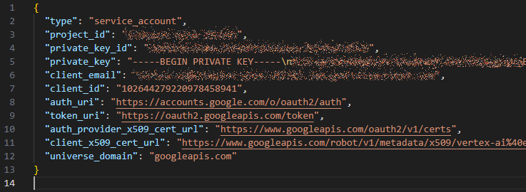 「Vertex Credentials」については、GCPのコンソールからダウンロードしたJSONファイルの中身はこのようなJSONになっていますが、これをすべて選択して「Vertex Credentials」に貼り付けましょう。