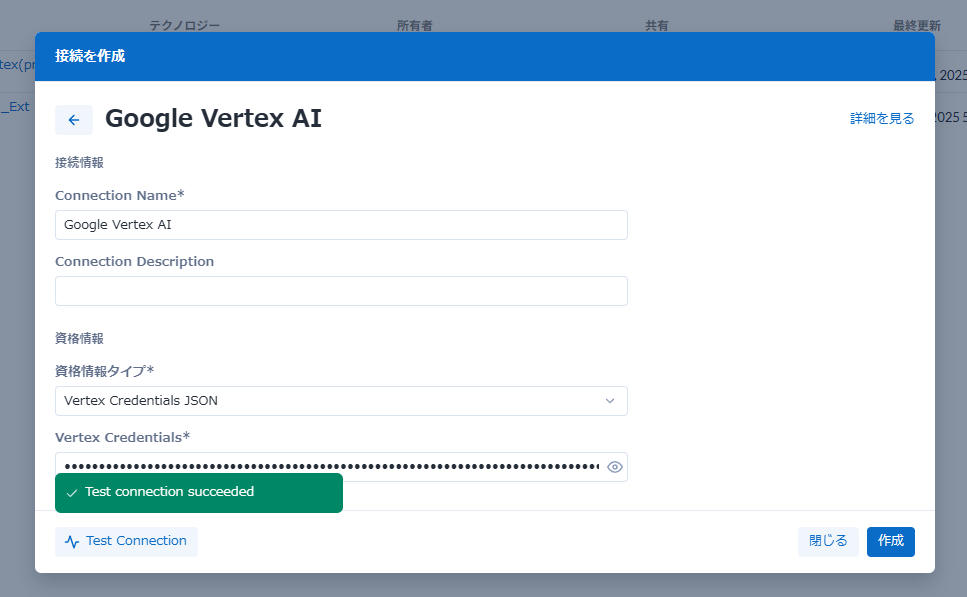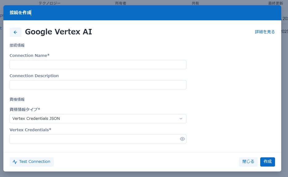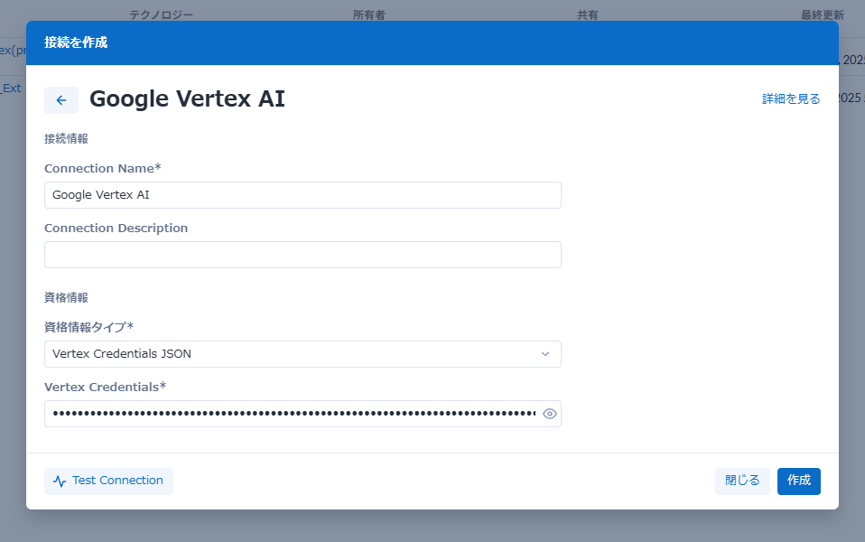 必要なのは、Connection Nameと資格情報となる「Vertex Credentials」のみです。Connection Nameはお好きな名前をつけてください。
