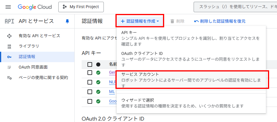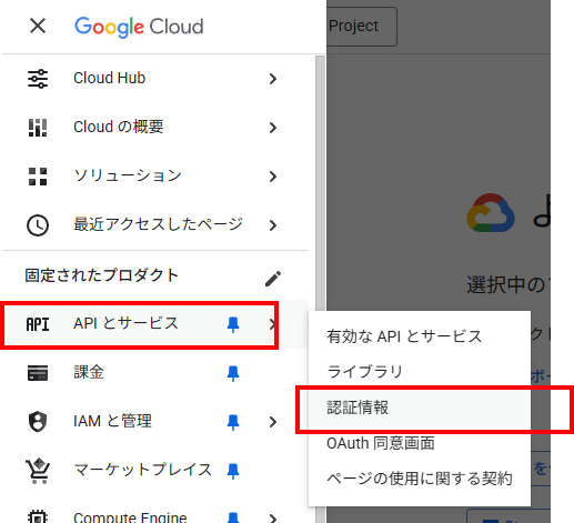 ここで、GCPのコンソールに移りましょう。GCPのコンソールにて、「APIとサービス」の「認証情報」をクリックします。