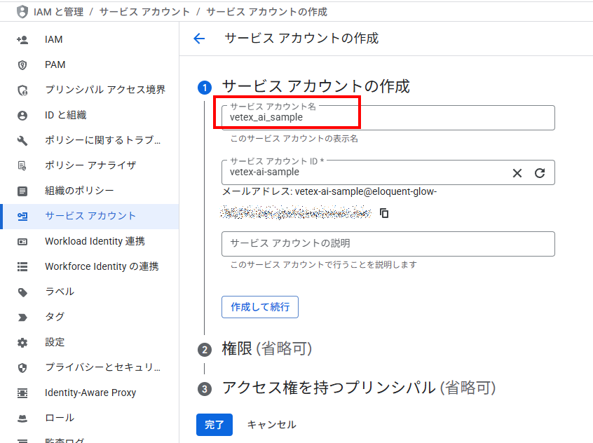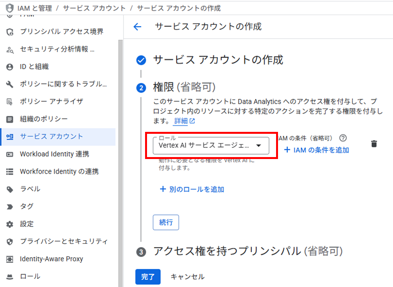 以下のように設定しましょう。権限は「Vertex AIサービスエージェント」で良いと思います。Vertex AIユーザーだと権限不足でした。