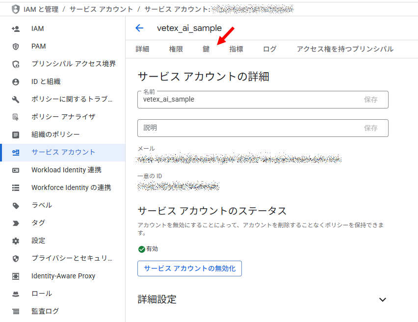これで、サービスアカウントのところに作成したサービスアカウントが追加されます