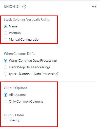 ユニオンツールのラベルが変更となりました。以下の赤枠内がシンプルになっています(例:Stack Columns Vertically UsingのNameとなっていますが、以前は「Automatically Configure by Column Name」といった形でした)。