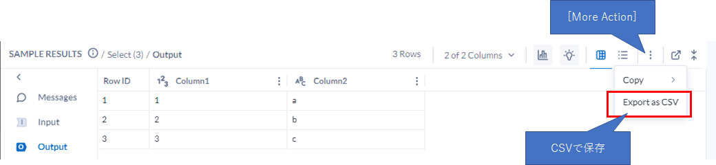 「SAMPLE RESULTS」ウィンドウにて、「More Action」から「Export as CSV」を選択することで、CSVファイル形式で保存することが可能です。