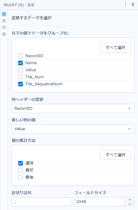 クロスタブツールを使って、RecordIDを列ヘッダーとして縦持ちから横持ちに転置します。