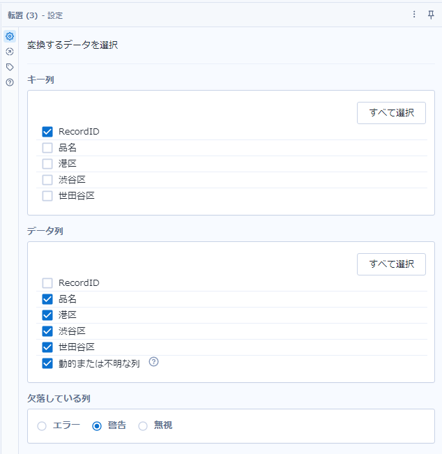 まずはレコードツールを使ってRecordIDを付け、横持ちから縦持ちに転置します。