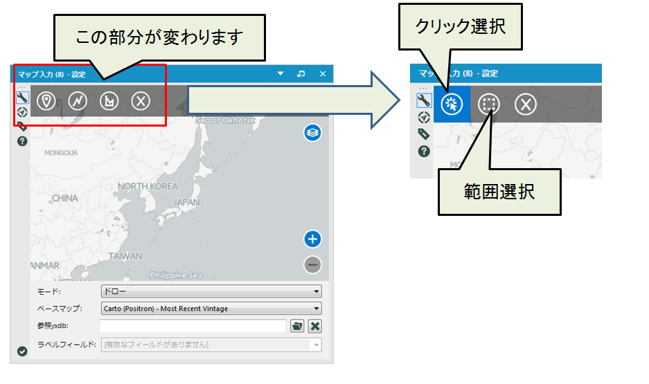なお、選択を選ぶとツール上部のアイコンが変化します。クリックで選択、もしくは範囲選択(Box選択)が使用できます。