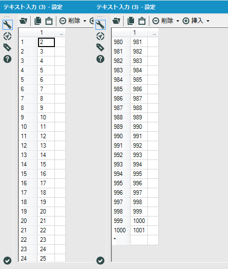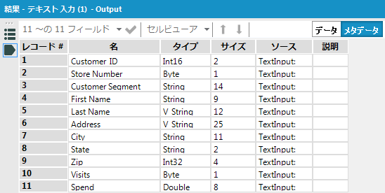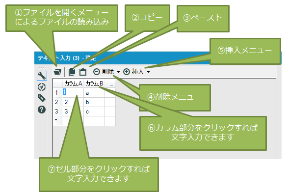 Excelのようにセルを埋めていくことで、ワークフロー内にデータを埋め込みます。このツールに入力されたデータはファイル入力ツールと同様に使うことができます。