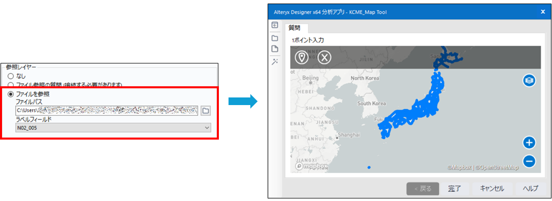 ファイル参照ツールと繋がると、自動で選択されます。空間情報が含まれているファイルを選択するとマップに空間情報が表示されます。