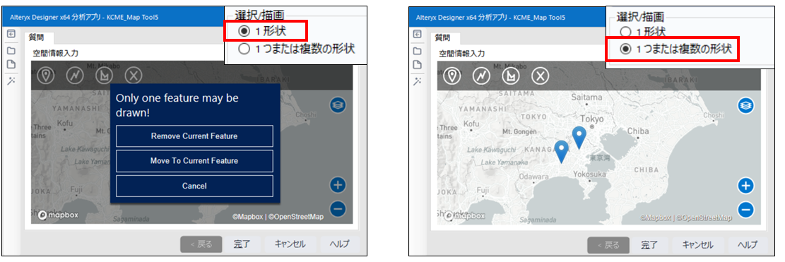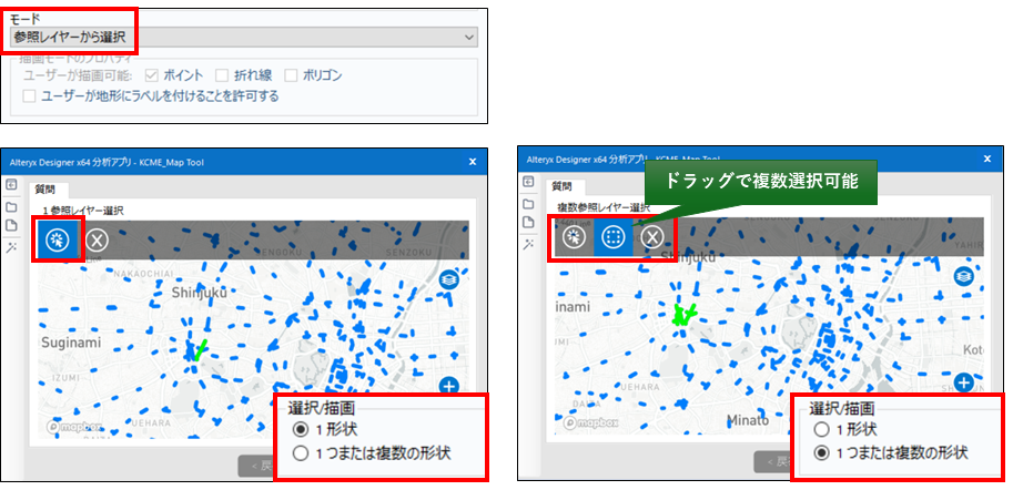 ・選択/描画のオプションに「1形状」を選ぶと一つだけ選択でき、「1つまたは複数の形状」を選択すると複数の空間情報を選択することができます。