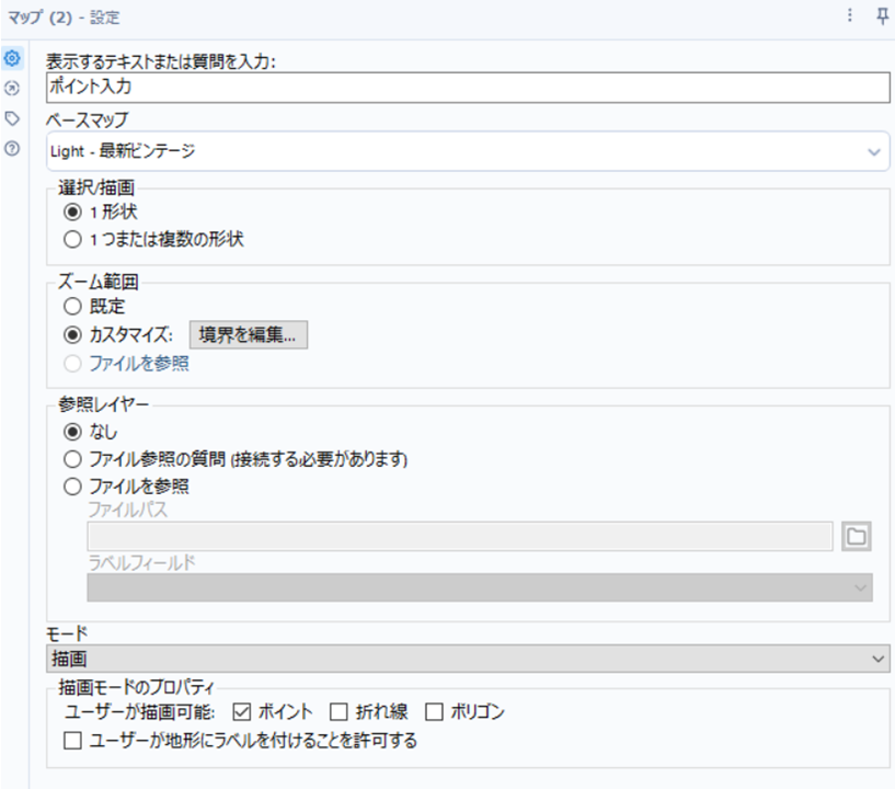 | モード | ユーザーがポイント、ライン、ポリゴンを作成するか、空間オブジェクトを参照レイヤーから選ぶか選択します。 |