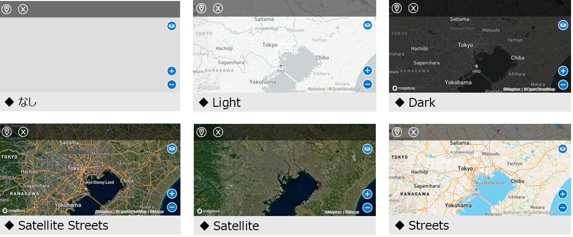 6つの種類があり、各マップレイヤーの背景は以下のように表示されます。