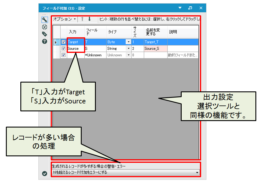 | 16を超えるレコード付加時に警告 | 「S」入力のレコードが17以上の場合「結果」ウィンドウに警告が表示されます(ワークフローは実行されます)。 |