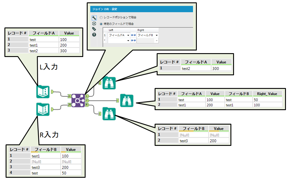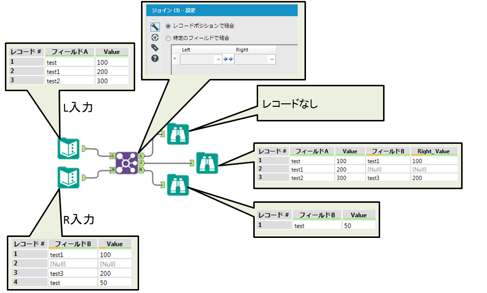 ただし、各入力のレコード数が異なる場合は、レコード数が少ない方にあわせて出力されます。余ったレコードはLまたはRに出力されます。