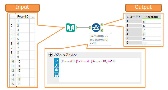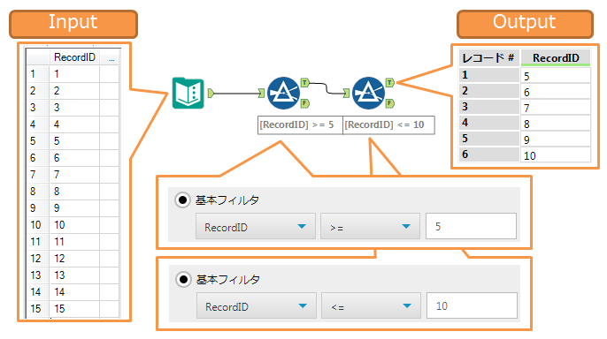 サンプルとして、RecordIDが5以上10以下のレコードを抽出するフィルタを作ってみました。基本フィルタのみでやろうとするとフィルタを2段にしなければなりません。ワークフローとしては以下のような形となります。
