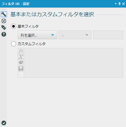 | 基本フィルタ | 演算子(大なり小なり、不等号等)一つとフィールド名を選択し、比較結果をTrue/Falseで分岐させる単純なフィルタです。