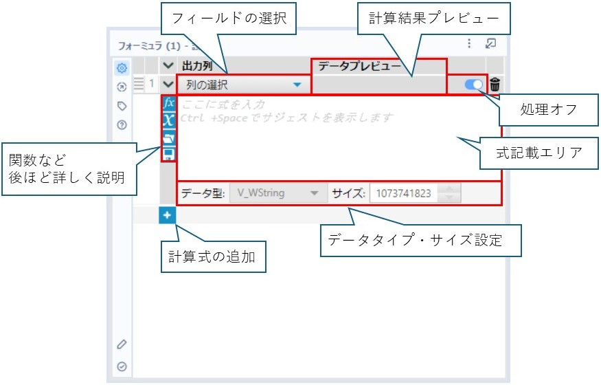 | 式記載エリア | 処理したい処理内容(関数等により作成)を記載します。 |