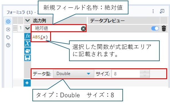 設定値は新規フィールドとして名称を「絶対値」と入力します。データタイプは数値型です。今回は「Double(浮動小数点型)」とします。サイズは数値の場合は自動入力されます。