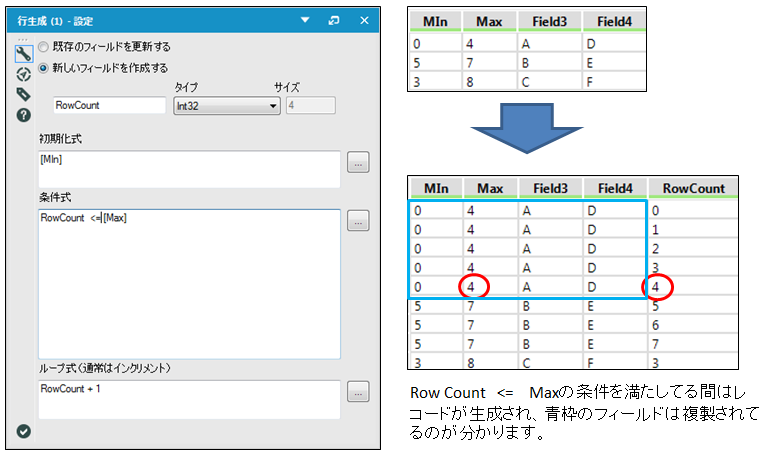 入力データの「Min」「Max」フィールドを使用した実行例です。Min値からはじまりMax値までレコードを生成しています。