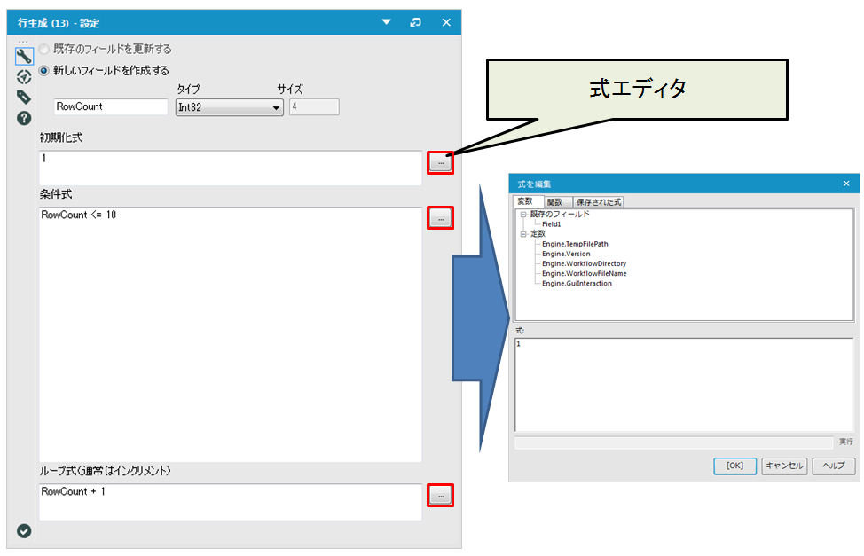 行生成ルールの右位置にある「…」ボタンをクリックすると「式エディタ」が開きます。エディタを使用して関数や、入力データのフィールド使用した変数を作成することも可能です。