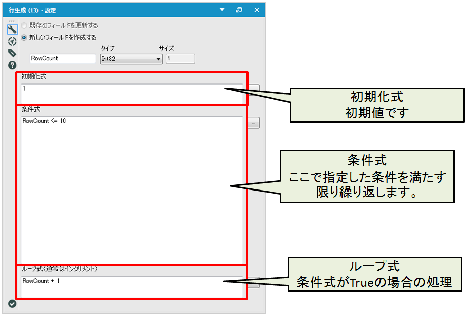 行生成ルールは「初期化式」「条件式」「ループ式」の3つに分解されます。