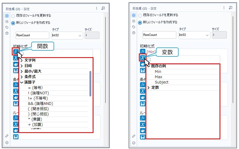 以下の画面のように「関数」ボタンを選ぶとAlteryxで提供されている関数を選択ができ、「変数」ボタンを選ぶと使用可能な変数が選択できます。