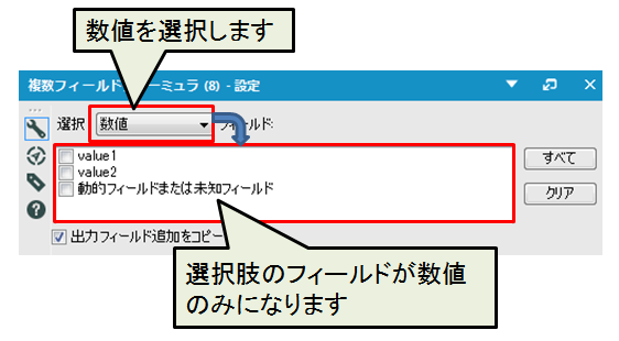 データをツールに接続します。今回は対象フィールドは数値ですので「数値」を選択します。そうすると、選択肢のフィールドが数値フィールドのみになります。