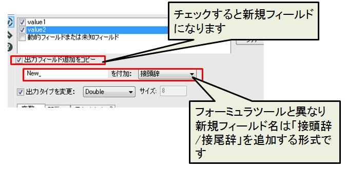 「value1」「value2」にチェックを入れます。今回は新規フィールドとして出力するので「出力フィールド追加をコピー」にチェックを入れます(チェックを外すと、既存データの更新になります)。「New_」を接頭辞として既存フィールド名に追加します。出力タイプは「Double」にします。