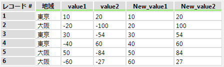 実行結果です。「New_」を接頭辞とした新しいフィールドが追加されました。それぞれABS関数で処理されているため、絶対値を取った値が取得されています。