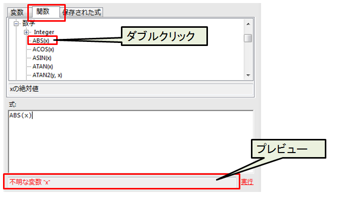次に関数を選択します。関数カテゴリはフォーミュラツールを参照ください。関数>数学からABS(絶対値を求める)をダブルクリックします。式記載エリアに関数が表記されます。