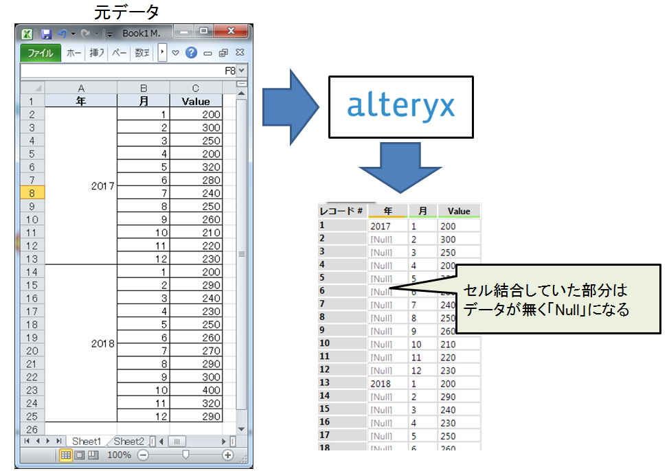 次の様にセル結合されたExcelの表をAlteryxに入力します。そうするとAlteryx上ではセル結合していた部分はデータが無く「Null」になってしまいます。このままでは年が不明なデータレコードとなってしまいますので、本ツールで補完していきます。
