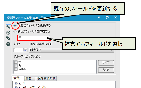 「年」フィールドを更新しますので「既存のフィールドを更新する」を選択し、対象フィールドは「年」を選びます。